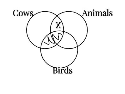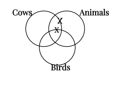 An ‘X’ in the intersection of circles labelled ‘cows’ and ‘animals’, but on the border of ‘birds. A second ‘X’ in Animals and outside of birds, but on the border of ‘cows’.