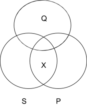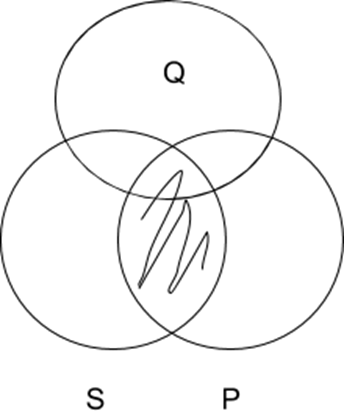 Note: it is difficult to offer a clear and uncontroversial counterexample which shows why it this rule is invalid for I sentences. After all, for the conclusion to be true, there need only be some category Q which doesn’t fully overlap with either S or P and which has at least one element in it which is neither in S nor P. So, proving the form of argument is invalid requires the possibility of a pair of properties, S and P, where at least some S are P, and where nothing is neither S nor P. Because giving a clear counterexample would require discussing issues in the philosophy of language and metaphysics that go beyond the scope of our course, we’ll simply let the Venn Diagram do the work for us of showing that the existence of something in the intersection of S and P doesn’t appear to immediately imply the existence of something else which is outside of both S or P.