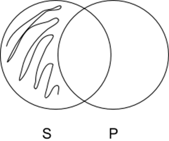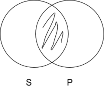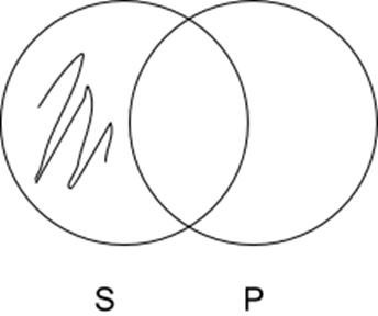 A Sentences: All S are P. Two intersecting circles, with ‘S’ filled in where it doesn’t intersect with ‘P’.