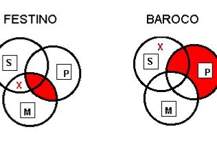 Modus Festino: the intersection of P and M is shaded; there is an X where S and M intersect but not P. Modus Baroco: there is an X in S which is outside of P or M; all of P is shaded except where it intersects with M.